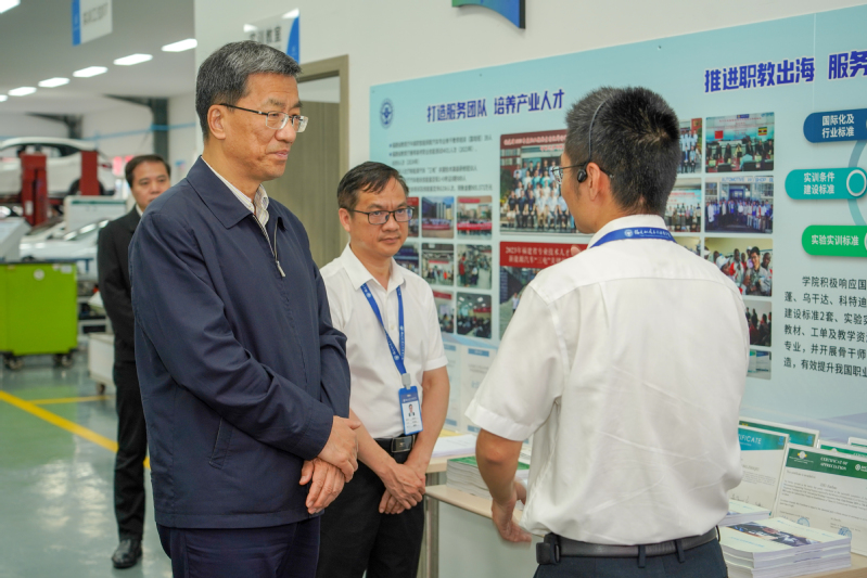 在新能源汽车产教融合示范园,怀进鹏部长与教师代表亲切交流,深入了解校企“七个共同”共建新能源汽车产教融合示范园的经验做法,肯定了学院积极服务和融入“一带一路”倡议、教随产出,建设沙特海丝学院的工作成效。在交通土建智慧检测产教融合实训基地,怀进鹏部长重点了解了云课堂的效果,听取了专业应对产业升级转型的对策,对开展技术服务给予了肯定。在先进舰船模拟器实训中心,怀进鹏部长详细了解了人才培养的有关情况,观看了心澜船社学生非遗手工作品——福船代表赶缯船的模型。在航空实训基地,怀进鹏部长重点了解学院军民融合开展产品设计研发的有关情况,并给予勉励。