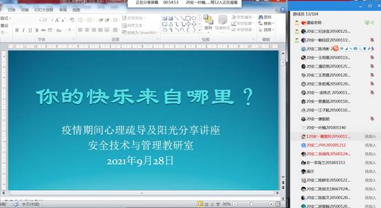 为帮助学生们以更加理性平和的心态应对疫情,安全与环境学院第二党支部党员突击队利用微信群、QQ群及相关新媒体,推荐和分享优质学习资源,开展在线研讨,积极传播正能量。潘瑜老师通过网络平台向20级在校生开展“疫情期间心理疏导及阳光分享讲座”,使全体学生知晓、理解和配合疫情防控工作,以积极、乐观的心态面对疫情,以顽强的意志、坚定的信念战胜疫情。