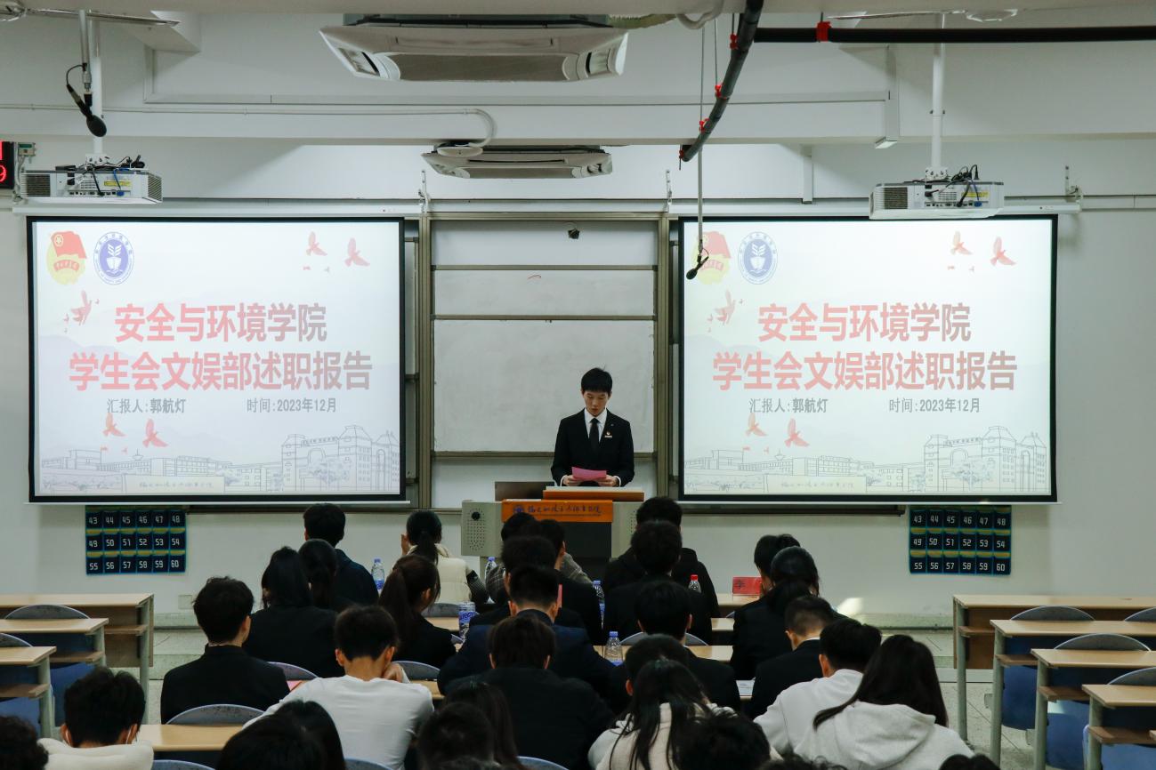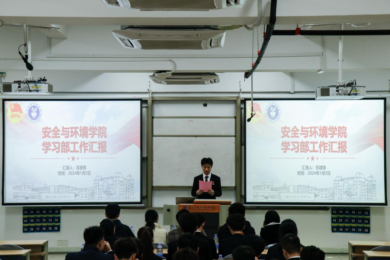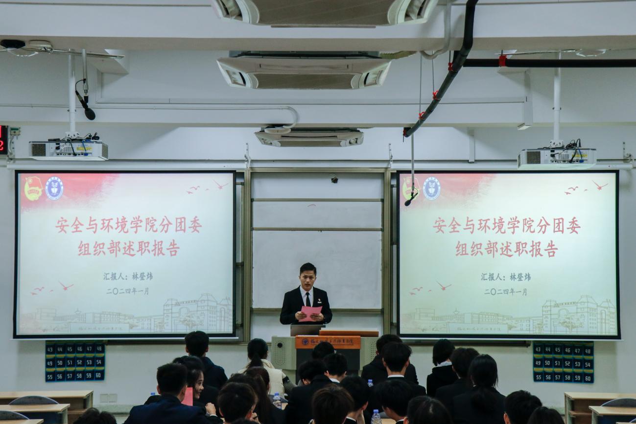 为深入学习贯彻习近平总书记关于青年工作的重要思想,进一步推动学生组织建设,提高学生干部综合素质,总结本学年工作实效,规划下一年度工作,2024年1月2日安全与环境学院在创新楼201教室组织召开团委学生干部述职大会。安全与环境学院团委书记彭志允、团委组织委员张晓珊、团委宣传委员李花、辅导员牟鹏飞、辅导员何瀚深莅临本次会议。