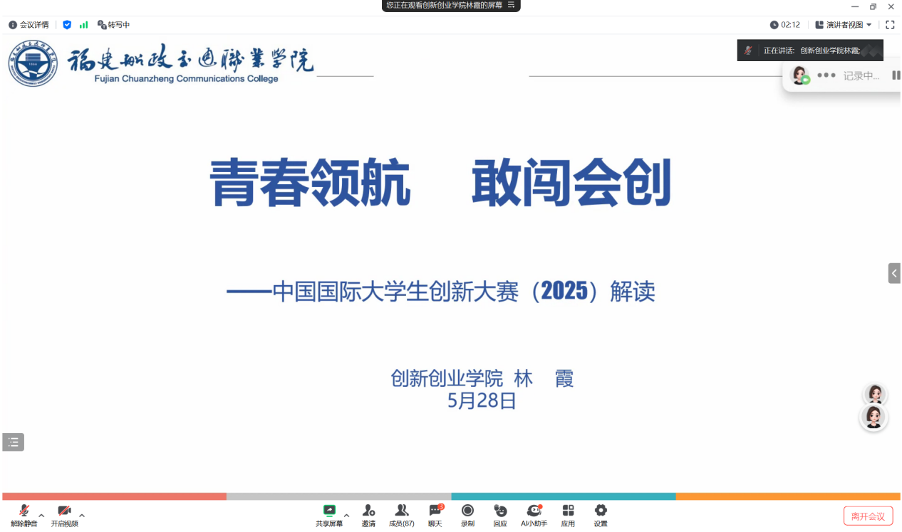 5月28日晚,我校通过腾讯会议举办中国国际大学生创新大赛(2025)专题讲座,由创新创业学院林霞院长主讲,100余名参赛师生听取讲座。
