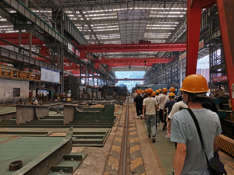 坐在车上从远处遥望就可以看见一座石像屹立在前方,那是马尾造船厂创始人沈葆桢的石像。下了车,马尾造船厂负责人热情向我们走来,带着讲解员为在场学生们细细讲述马尾造船厂这155年来的建厂史,它浓缩了中国近代富国强兵的探索历程。随后,跟随着讲解员的步伐我们来到基地的设备制造厂,参观最新的造船设备,感受精湛的造船工艺。最后,航海学院师生一行人来到码头,参观造船工艺成果。