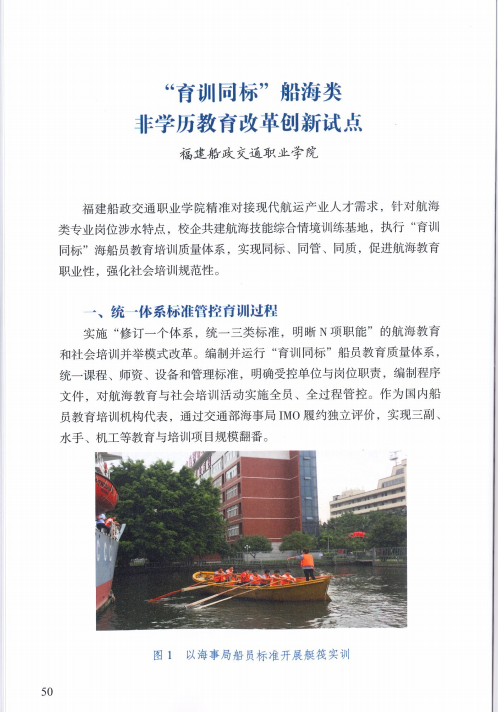 《“育训同标”船海类非学历教育改革创新试点》项目基于我校航海技术“双高”专业群优势资源和育人成果,针对航海人才培养和社会培训与行业需求脱节、育训情境缺乏、质量监控不足、评价考核手段单一、师资能力偏弱等问题,从课程内容、教学活动、过程监控、考核评价和科技服务等方面进行系统重构,执行“育训同标”海船员教育培训质量体系,实现同标、同管、同质,强化航海教育职业性,提升社会培训规范性。