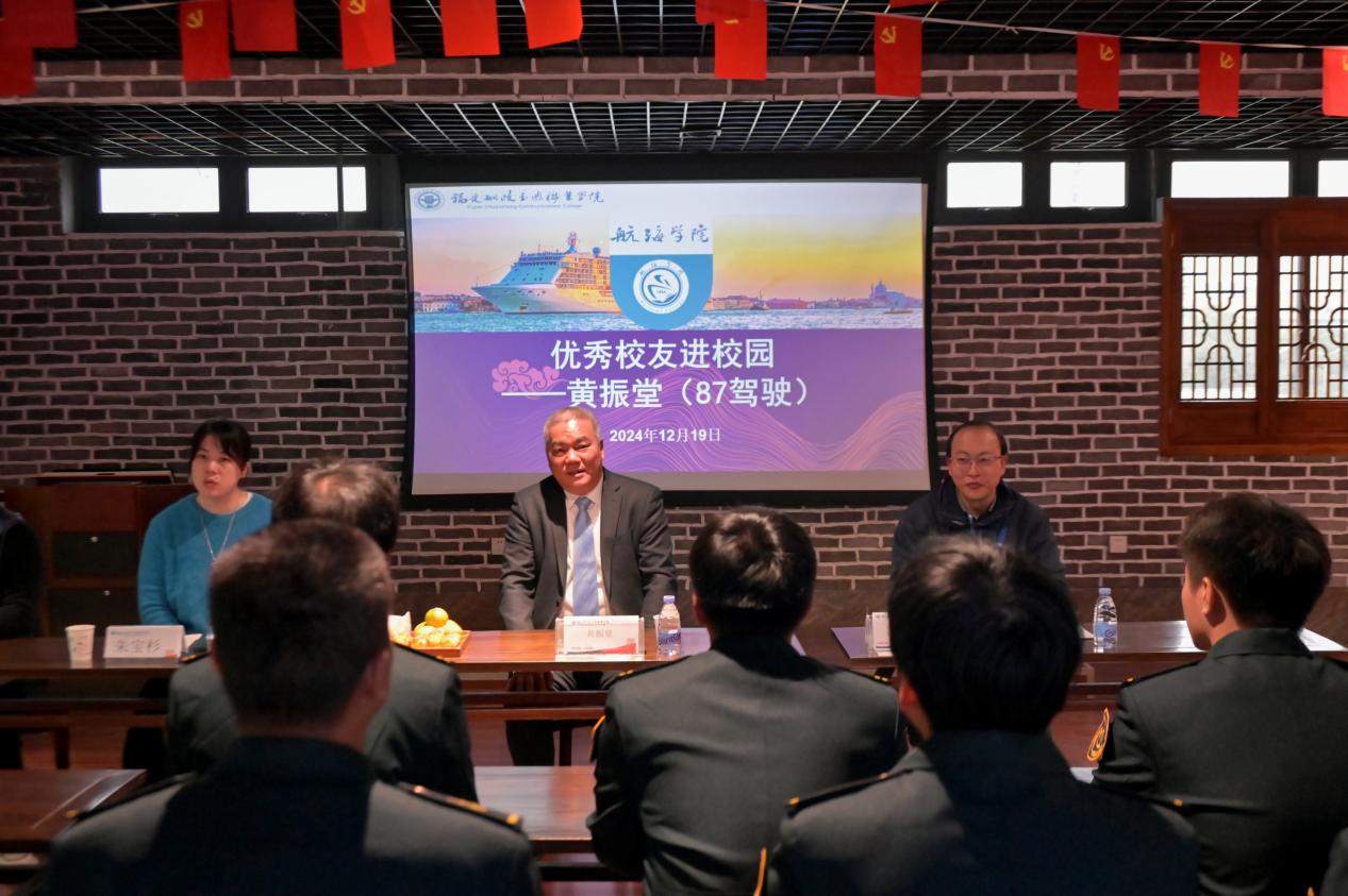 随后,优秀校友黄振堂发言。他表达了对母校悉心栽培的感激之情,并分享了在校期间的学习心得与成长经历。详细阐述了毕业后在远洋船舶甲板部各个工作岗位上所遇到的挑战与机遇,以及如何通过不懈的努力与持续的学习实现个人价值的提升。如今作为资深船长的他也成立了自己的航运公司,为世界航海事业贡献力量。紧接着,他建议同学们在面对专业学习时要不惧困难,认真对待,避免时间的过度浪费;在面对个人职业选择时,要发挥专业优势,到船上进行实践,从而探索最符合自身发展人生航道。