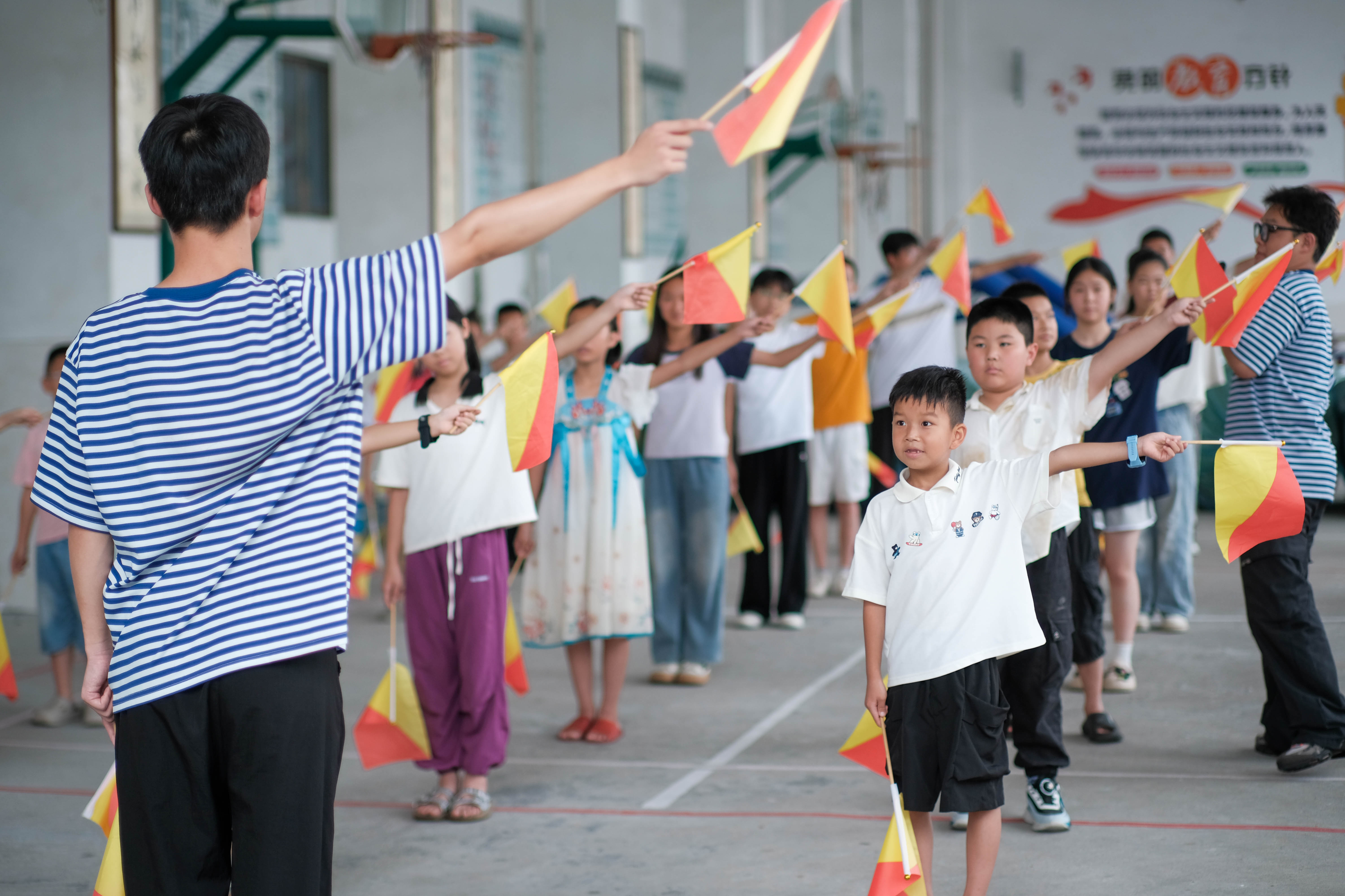 操场一角,两面红黄小旗在阳光下格外醒目。“山海呼唤 船启童窗” 实践队队员手持旗帜示范,孩子们很快学会用手臂划出标准角度。当 “旗语传声” 游戏开始,三十人分成五组,用旗语传递 “船要靠岸” 的信号,错误时的哄笑与成功时的欢呼交织成独特的旋律。