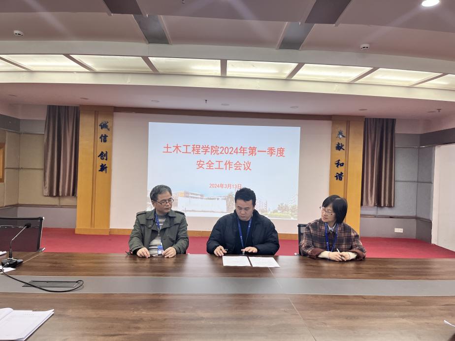 2024年3月13日下午,土木工程学院在创新楼1007会议室,召开了学院2024年第一季度安全工作会议,第一时间传达学习上级有关文件和会议精神,分析研判当前学院安全稳定工作形势,对做好下一步安全工作进行部署并签订本年度的安全责任书。学院领导班子成员、教研室主任副主任、办公室人员、全体辅导员及全体实训中心成员参加了会议,会议由朱明栓副院长主持。