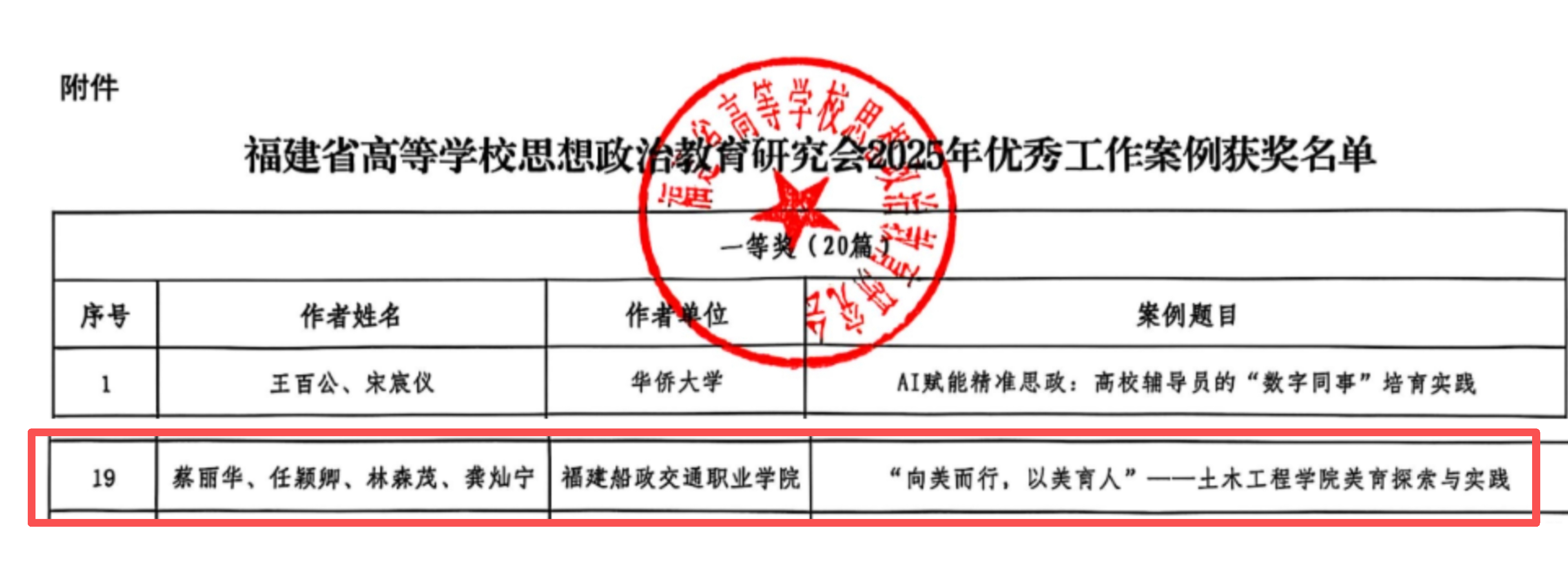 近日,福建省高等学校思想政治教育研究会公布了关于表彰2025年优秀工作案例的通知。土木工程学院网络育人工作案例《“向美而行,以美育人”——土木工程学院美育探索与实践》获评一等奖。