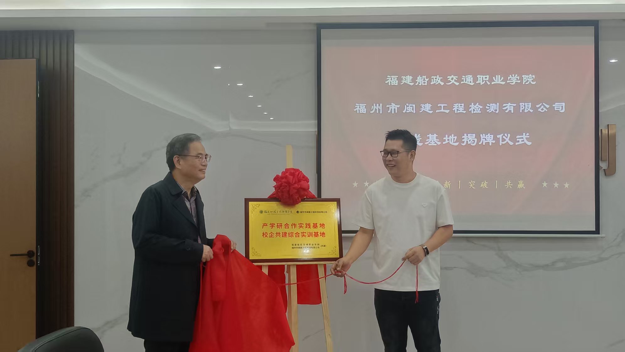 随后,土木学院书记高杰与闽建检测总经理吴文岳共同为“校企共建综合实训基地”揭牌。