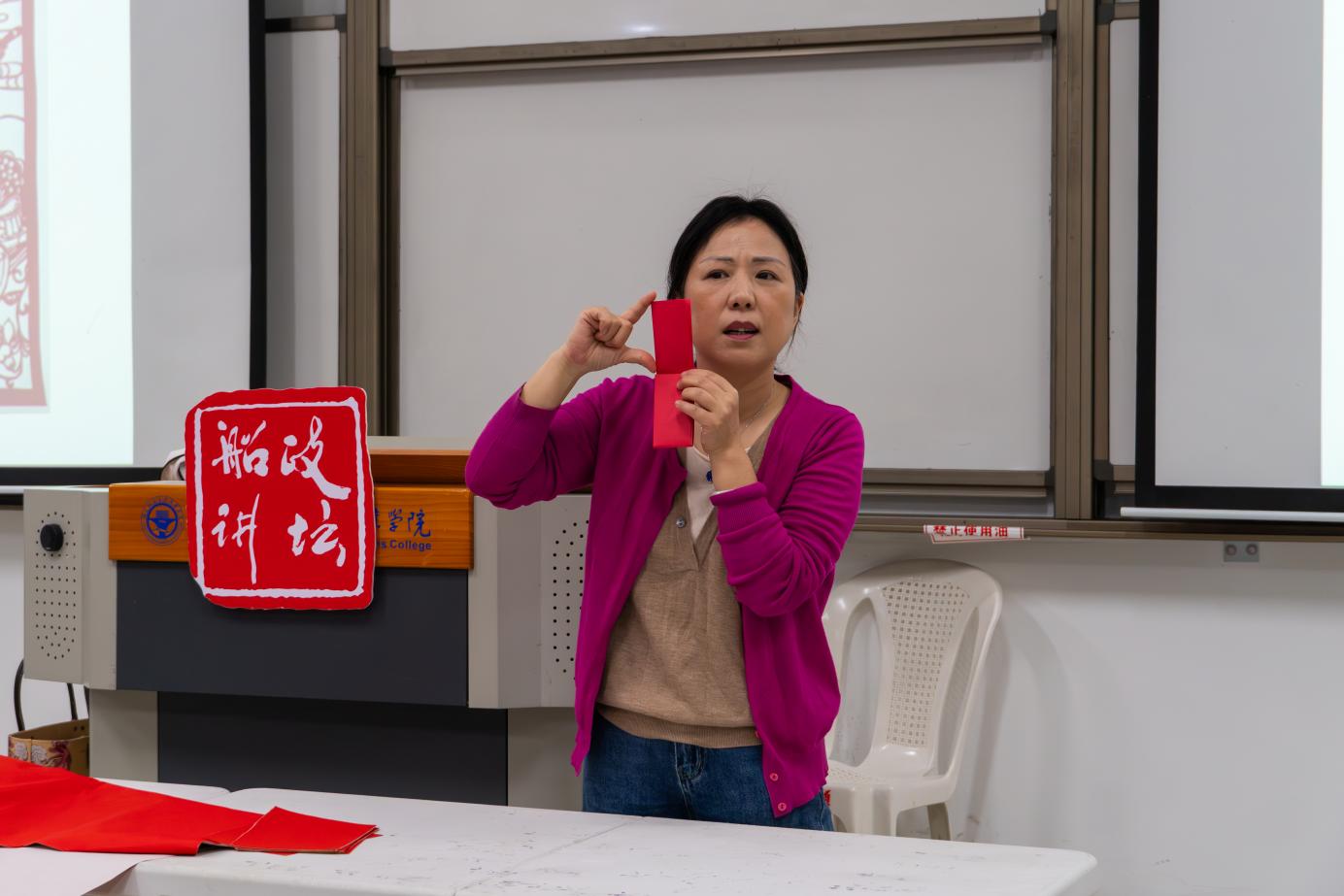 讲座开篇,董老师展示多幅精心甄选的剪纸佳作,灵动的线条、精巧的构图让在场学生直观领略到剪纸艺术的匠心巧思,她还结合作品背后的故事,生动解读了其中蕴含的自然意趣与人文情怀。随后,董老师循着历史脉络,娓娓讲述剪纸的起源流变,以通俗易懂的语言解析不同朝代剪纸的艺术特征、社会功能与文化内涵,让同学们深刻体会到这项传统技艺穿越时空的鲜活生命力。