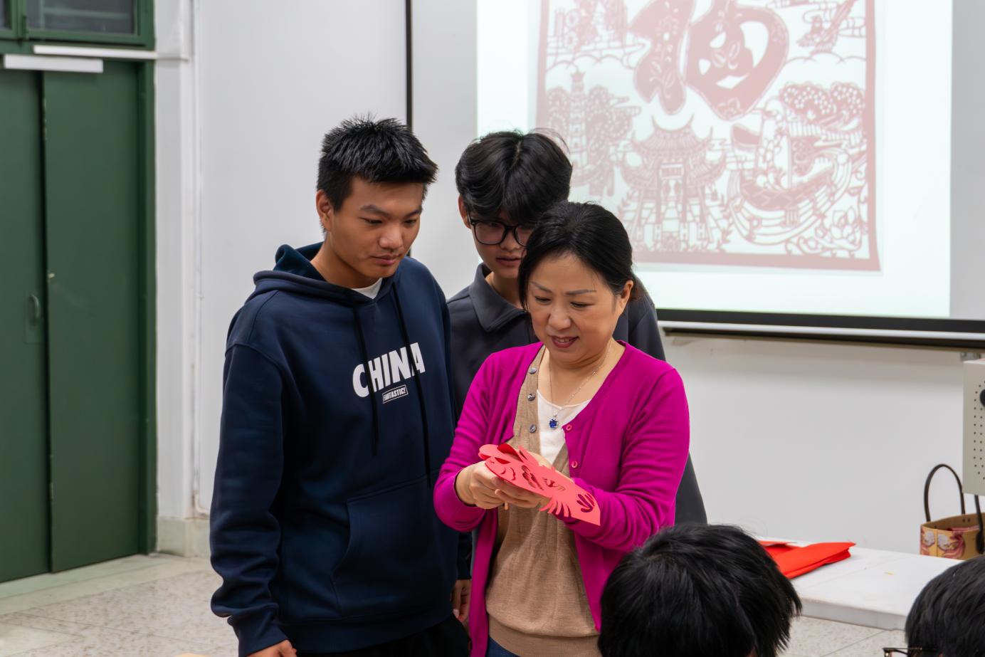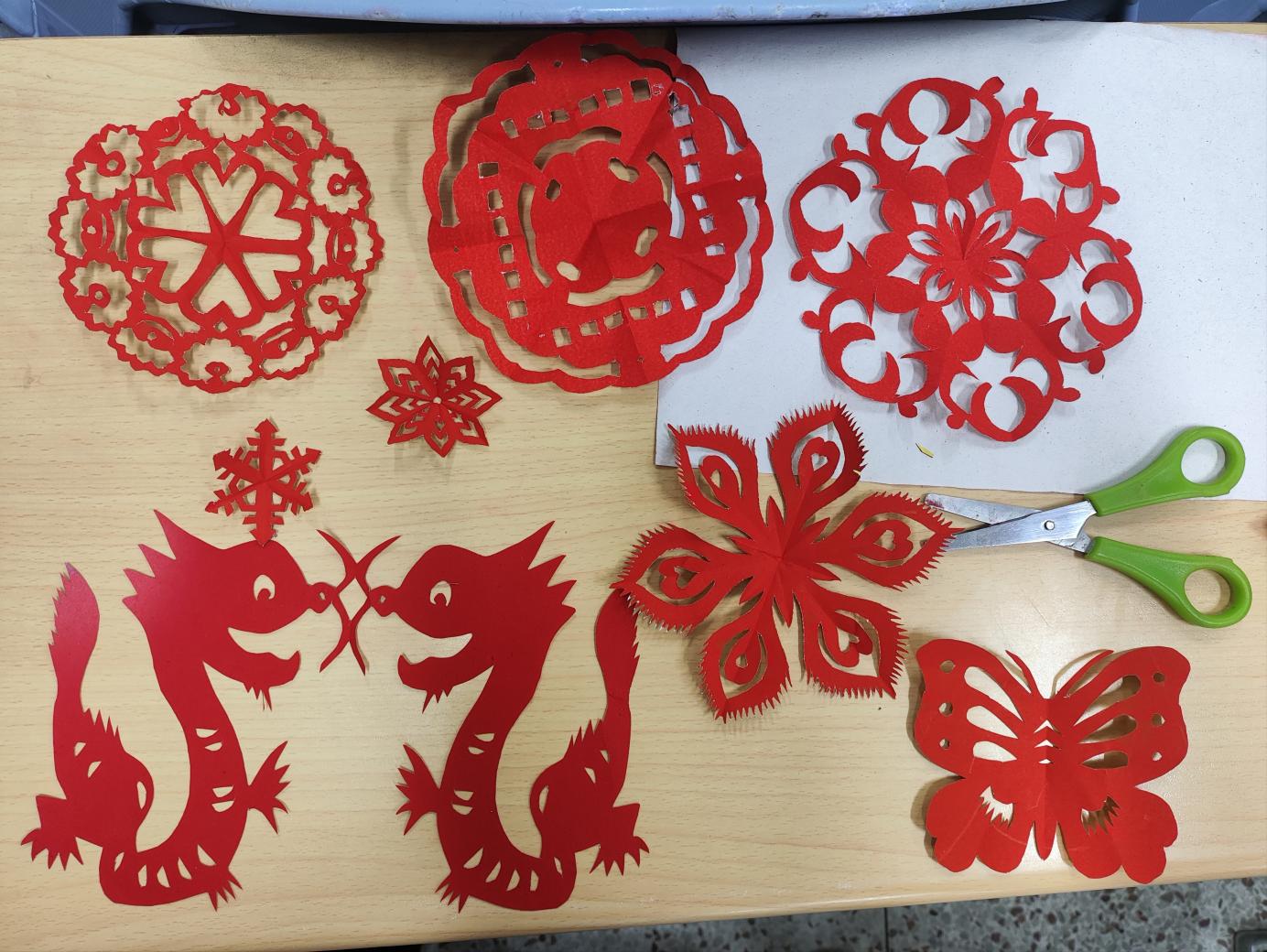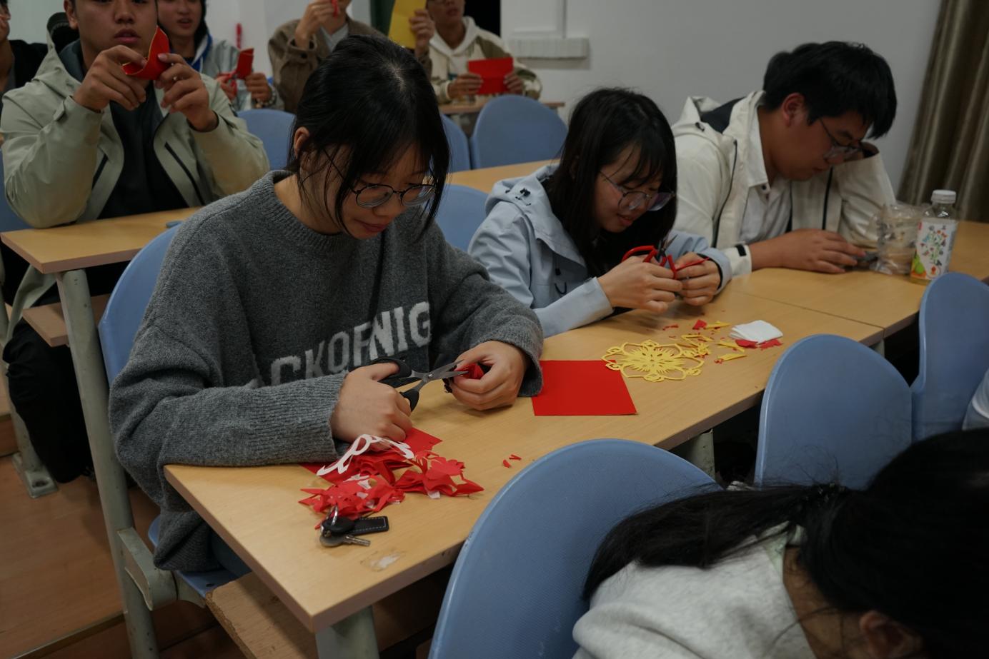 进入实践创作环节,董老师亲自示范指导,耐心解答学生们的疑问。同学们热情高涨、踊跃参与,红纸在指尖翻飞,剪刀在纸上流转,一个个独具巧思的图案逐渐成型。