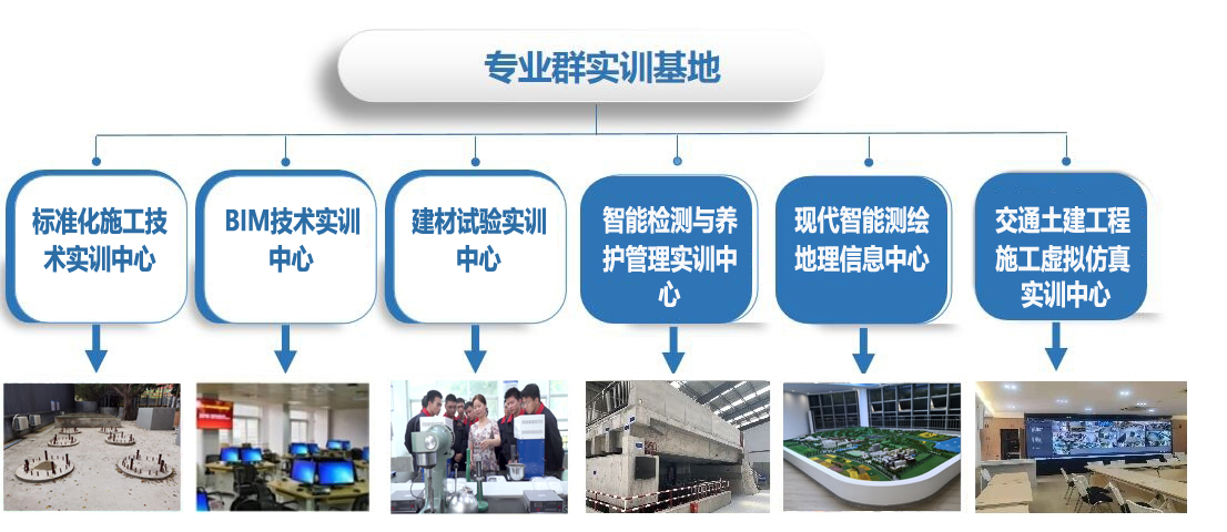 交通土建专业群实训基地是“国家高等职业院校创新行动计划校企共建生产性实训基地”,2020年入选福建省省级职业院校高水平专业化产教融合实训基地。与省内外近60多家知名企业合作共建覆盖交通基础设施设计、施工、管养等全领域的校内外实训基地,充分满足学生学员实习实训需求。为国家“1+X”证书建筑信息模型(BIM)、无人机技术、无损检测技术、装配式技术,交通部施工现场专业人员培训及考核基地。经过多年建设发展,校内现有各类实训场馆及科研场所建筑面积8000多平方米,室外实训场地约30000平方米,包含土木工程数字化融创中心、现代智能测绘技术技能中心、智慧检测实训基地、交通土建标准化智慧实训基地、施工工艺虚拟仿真实训中心、产教融合实训基地等18个校内实训基地。主要实验实训台套数近2200台套(工位),设备总价值约3000万元。实践教学条件处于国内同类院校同类专业领先水平。