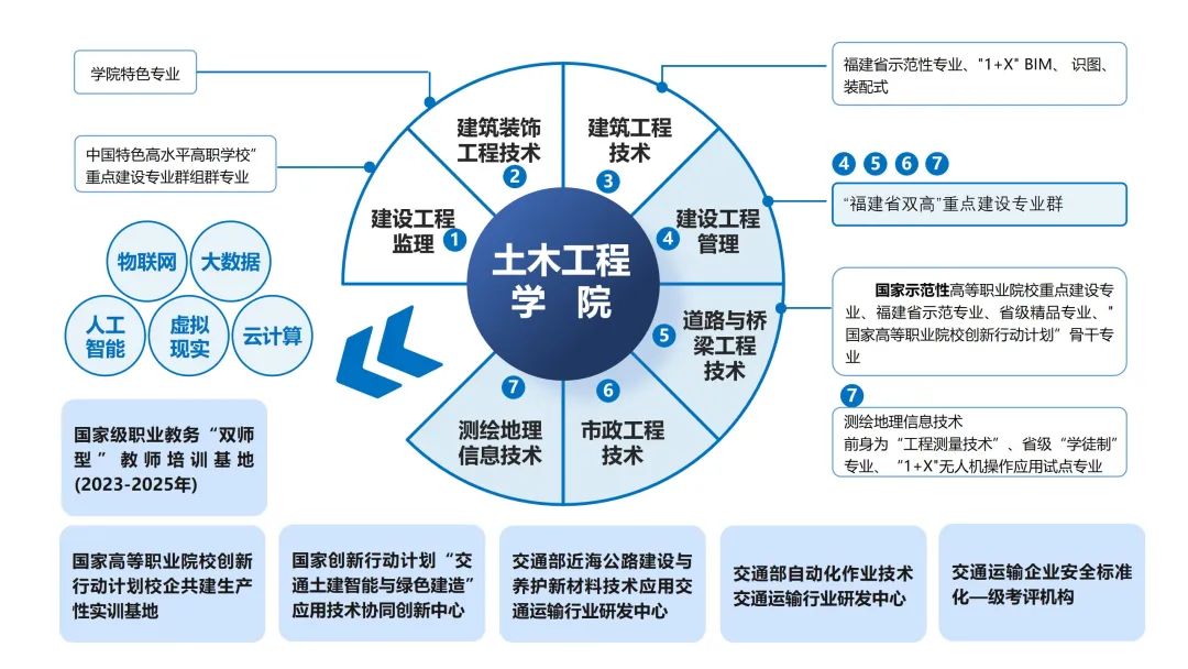 土木工程学院现有道路与桥梁工程技术、市政工程技术、建设工程监理、测绘地理信息技术、建筑工程技术、建设工程管理、建筑装饰工程技术7个专业。其中,道路与桥梁工程技术是首批国家示范性高等职业院校建设计划中央财政重点支持建设的专业(简称“首批国家示范性建设重点专业”)、国家创新发展行动计划骨干专业、福建省示范专业、福建省精品专业,“福建省双高”重点建设专业群的核心专业,2017年通过IEET国际认证;建设工程监理专业是“中国特色高水平高职学校与高水平专业建设计划”(简称“国家双高”)高水平专业群的组群专业;市政工程技术、测绘地理信息技术、建设工程管理专业是“福建省双高”重点建设专业群(道路与桥梁工程技术专业群)的组群专业;建筑工程技术是福建省高职院校示范性专业;建筑装饰工程技术专业为学校特色专业。