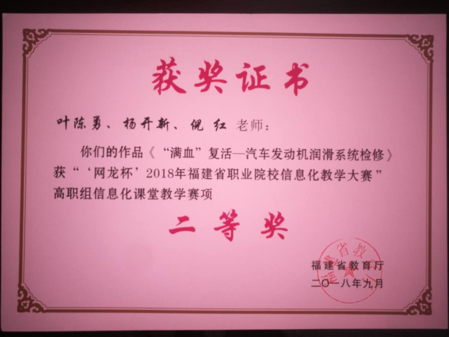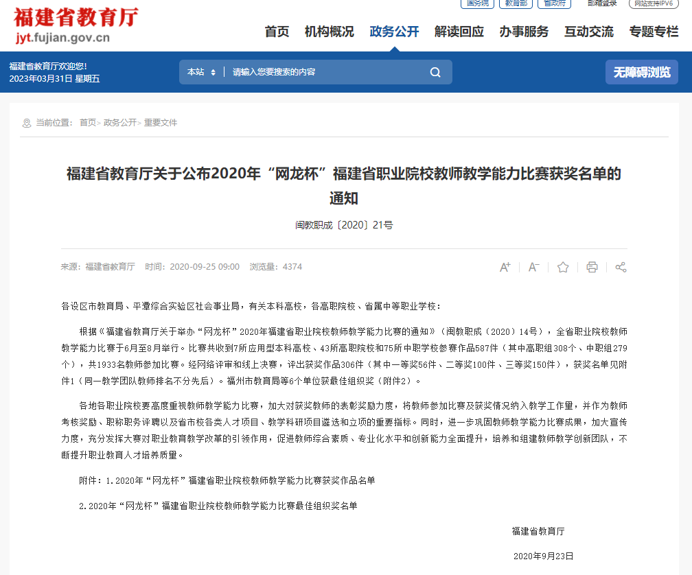 (六)2018、2019、2020年9月被福建省教育厅评为福建省职业院校教师教学能力大赛二等奖、一等奖、一等奖