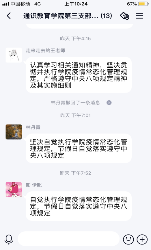 为加强廉政建设,持之以恒正风肃纪,严明廉洁过节各项纪律要求,根据学校纪委办通知精神,通识教育学院以支部党员大会、教研室例会等形式,组织广大党员和教师认真学习了学校纪委办公室《关于做好2021年度元旦春节期间正风肃纪工作的通知》。主要采用线上加线下相结合方式进行学习,通过学习,进一步提高了政治站位,强化了底线意识,提升以身作则知止敬畏的行动自觉,进一步增强作风建设的自觉性和坚定性。党员和教师均表示要以更高标准、更严要求落实中央八项规定精神、纠治“四风”,以风清气正的良好氛围为新阶段作风建设开好头、起好步;坚决杜绝形式主义,官僚主义,认真学习省纪委公开曝光的“四风”典型问题,严守纪律,坚持“纠四风”、树新风,进一步强化以人民为中心的服务理念,主动服务基层,服务师生;努力营造崇廉尚俭的节日氛围,确保务实、节俭、文明、清廉过好“两节”。