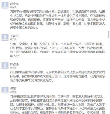 大家一致表示,深受教育、深受鼓舞、倍感振奋,将认真学习贯彻习近平总书记重要指示精神,在工作和学习中坚守初心、引领创新,展示高水平研究成果,弘扬中华文明,让世界更好地认识中国、了解中国。