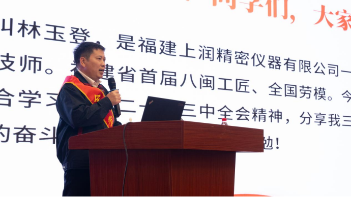 启动仪式后,全国劳动模范、全国技术能手、享受国务院政府特殊津贴专家福建上润精密仪器有限公司林玉登分享他30年工作的艰辛历程和生动事迹。他三十年如一日认真做好精密制造这一件事,“简单的事情重复做,重复的事情坚持做”,他用坚持不懈、永不放弃的精神为推动福建传统产业转型升级和智能制造做出了积极贡献。在场的观众都从林玉登劳模事迹中深刻感悟劳模精神、劳动精神、工匠精神的实质内涵。