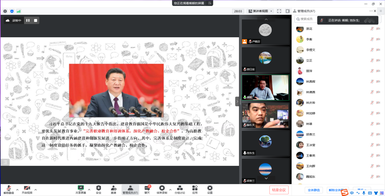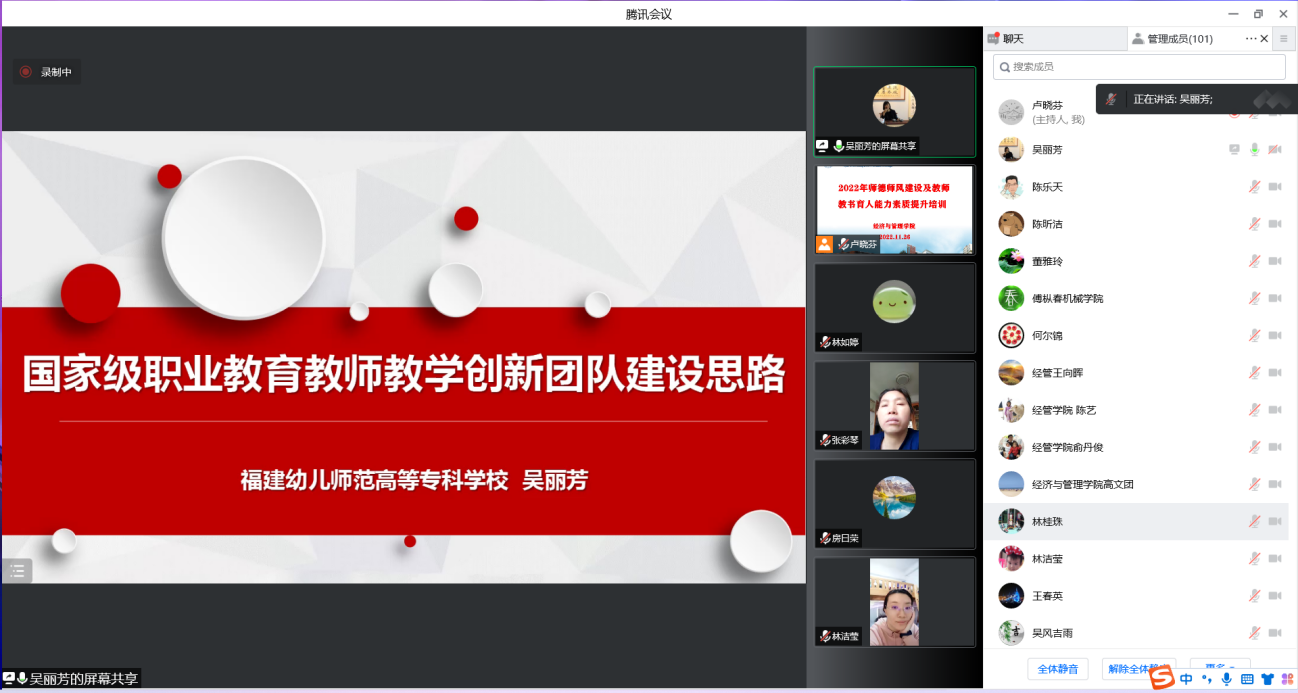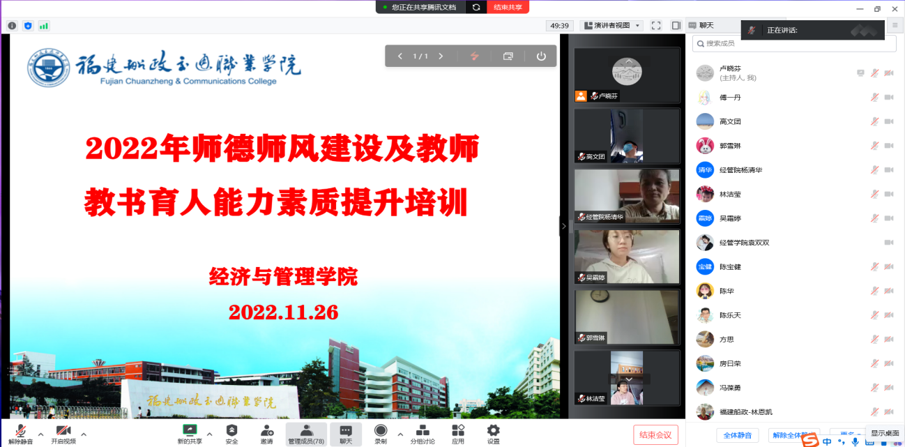 为加强我院教师队伍建设,促进教师专业成长,综合提升我院教师师德修养和能力水平,11月26至27日,我院举办2022年师德师风建设及教师教书育人能力素质提升培训。邀请了两位专家教授进行授课,吴丽芳教授,福建幼儿师范高等专科学校学前教育学院院长、首批国家级教学创新团队立项建设单位负责人、教育部职业院校教育类专业教学指导委员会委员,福建省杰出人民教师;熊毅教授,泉州经贸学院教务处处长、福建省名师、福建省教师教学创新团队负责人。经管学院全体专任教师、实验员、辅导员及其他学院老师参加本次培训。因疫情原因,本次培训通过线上形式进行,培训由房曰荣院长主持。