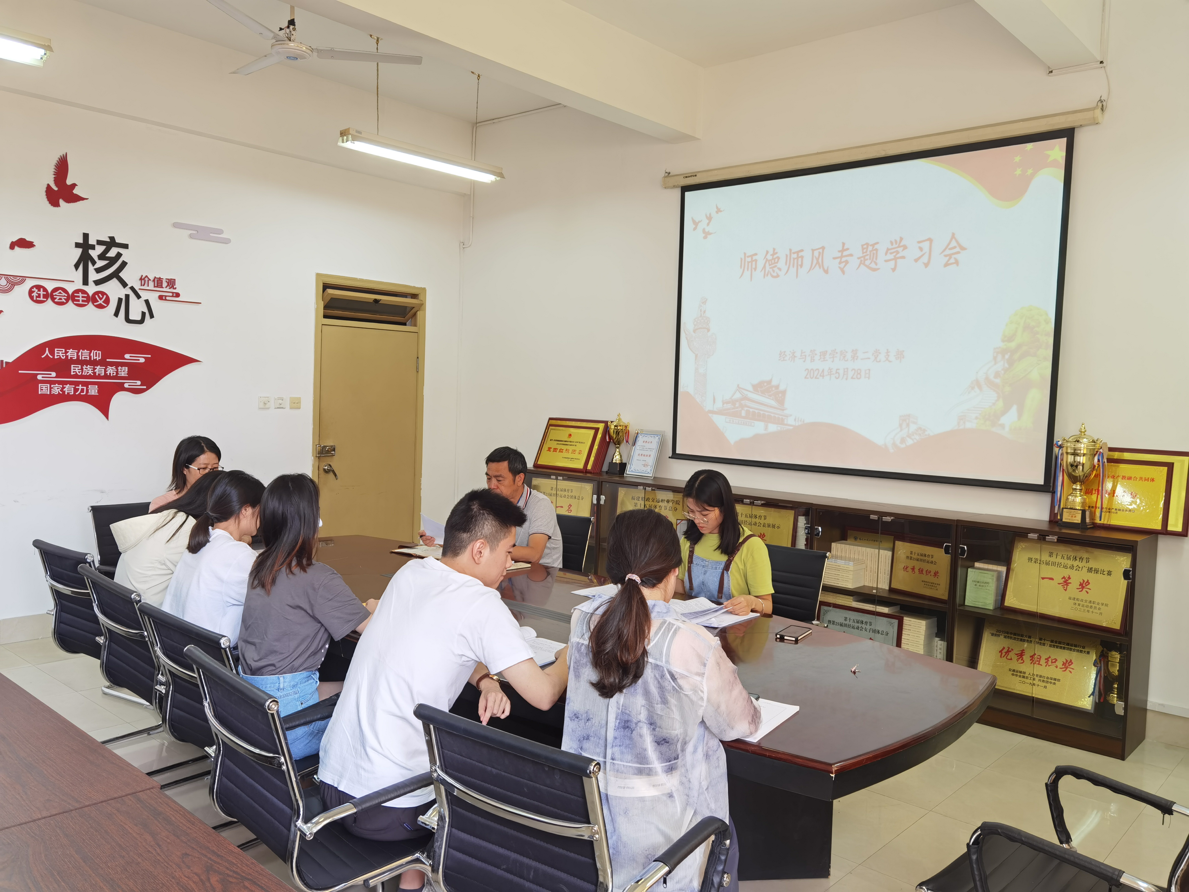 2024年5月28日,经济与管理学院第二党支部在31号楼412室开展师德师风专题学习会。旨在通过学习将理论融入日常的教育教学中,规范师德师风,共同树立和维护崇高的教育风尚。