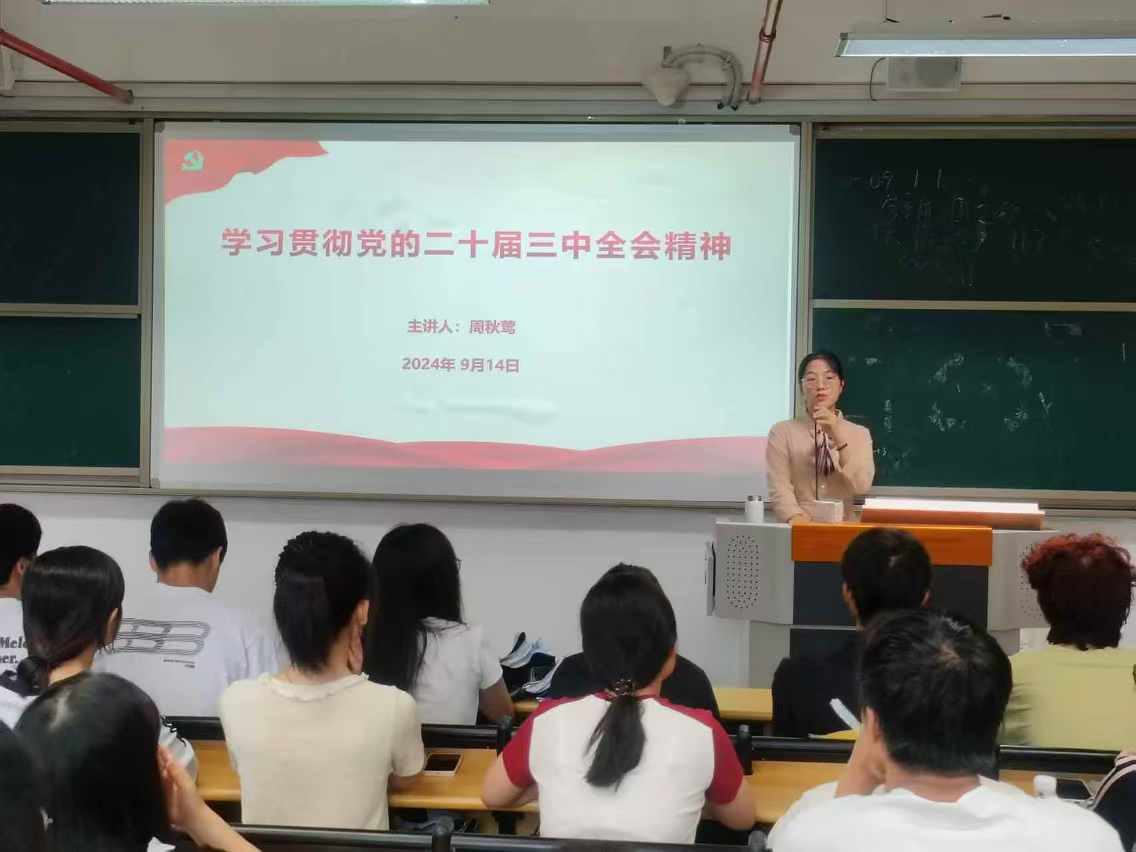 为深入学习贯彻党的二十届三中全会精神,激发师生深化改革的责任感和使命感,2024年9月14日下午,经济与管理学院第二党支部书记周秋莺在福船园艺新楼505给2023级入党积极分子开展党的二十届三中全会精神专题宣讲。