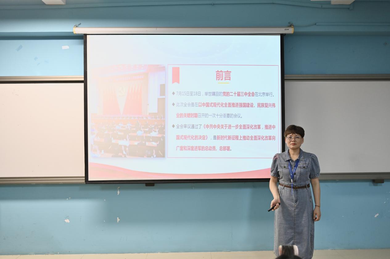 为引导青年学生深入理解党的二十届三中全会精神,将个人成长与国家发展紧密结合,用青春力量为时代添彩。9月22日,在庆祝中华人民共和国成立75周年之际,经济与管理学院党总支副书记林丽萍向24电商(3+2)4班和24现代物流管理(3+2)2班学生宣讲党的二十届三中全会精神。