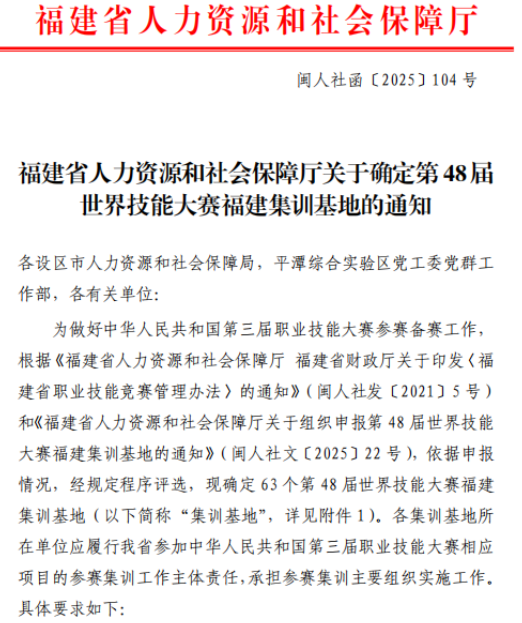 近日,福建省人力资源和社会保障厅公布第48届世界技能大赛福建集训基地评选结果,机械与智能制造学院1个竞赛基地成功入选福建集训基地,4名选手入围福建省集训队。这一突破充分展现了我院在技能人才培养方面的卓越实力,是学院深化产教融合、创新技能育人模式的成果缩影。