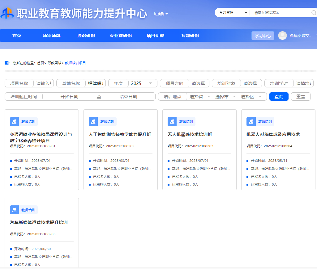 近日,教育部教师工作司公布2025年国家级职业教育教师培训项目评审结果,我院交通运输类国家级“双师型”教师培训基地牵头申报的5个项目全部入选。项目涵盖无人机遥感技术、交通运输业在线精品课程设计、汽车新媒体运营、人工智能训练师教学能力、机器人系统集成及应用技术等前沿领域,彰显了我院在职业教育师资培养方面的实力与前瞻性布局。