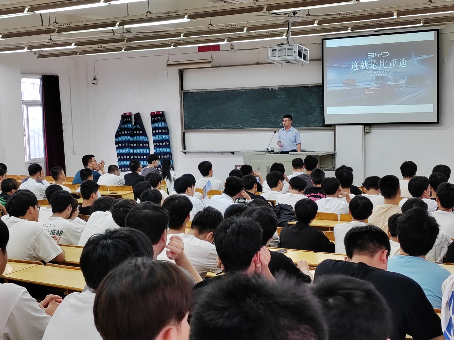 比亚迪宣讲会开场首先播放了比亚迪汽车有限公司的发展历程的宣传视频,震撼的视听效果激发了在场同学了解比亚迪的热情。接着比亚迪兰元经理介绍了比亚迪企业文化及其发展历程,企业产业结构和公司四大新能源发展方向。同时中车云商张可总经理介绍了比亚迪在新能源汽车领域做出的努力和成就,强调了比亚迪需要更多职业技术性人才,表示大力支持精诚英才项目,组织协调整个项目运行,并欢迎同学们积极踊跃的报名加入比亚迪订单班。