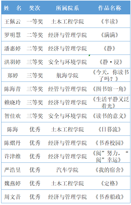 经过一个多月的作品征集及评选,我馆共收到来自九个学院几百篇优秀的摄影作品,经过评比有14名同学进入终评,最终评选出一等奖1名,二等奖2名,三等奖5名,优秀奖6名。让我们一起来看看,是哪些获奖者吧~