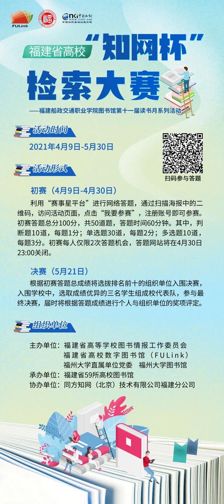 2021年是中国共产党成立100周年,也是“十四五”开局之年,在第26个“世界读书日”到来之际,福建省高等学校图书情报工作委员会特举办“知网杯”检索大赛,号召在校大学生学习党史,养浩然正气,努力践行习近平总书记“修身慎行,怀德自重,敦方正直,清廉自守”的要求,希望以赛促学,献礼党庆。现将有关事项通知如下: