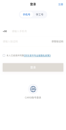 首次访问的读者需要连接校园网WiFi后,进入京东读书专业版平台,点击【注册】--选择【本人所在学校】--连接【校园网WiFi】完成身份认证,根据页面提示输入手机号、姓名等信息完成注册。