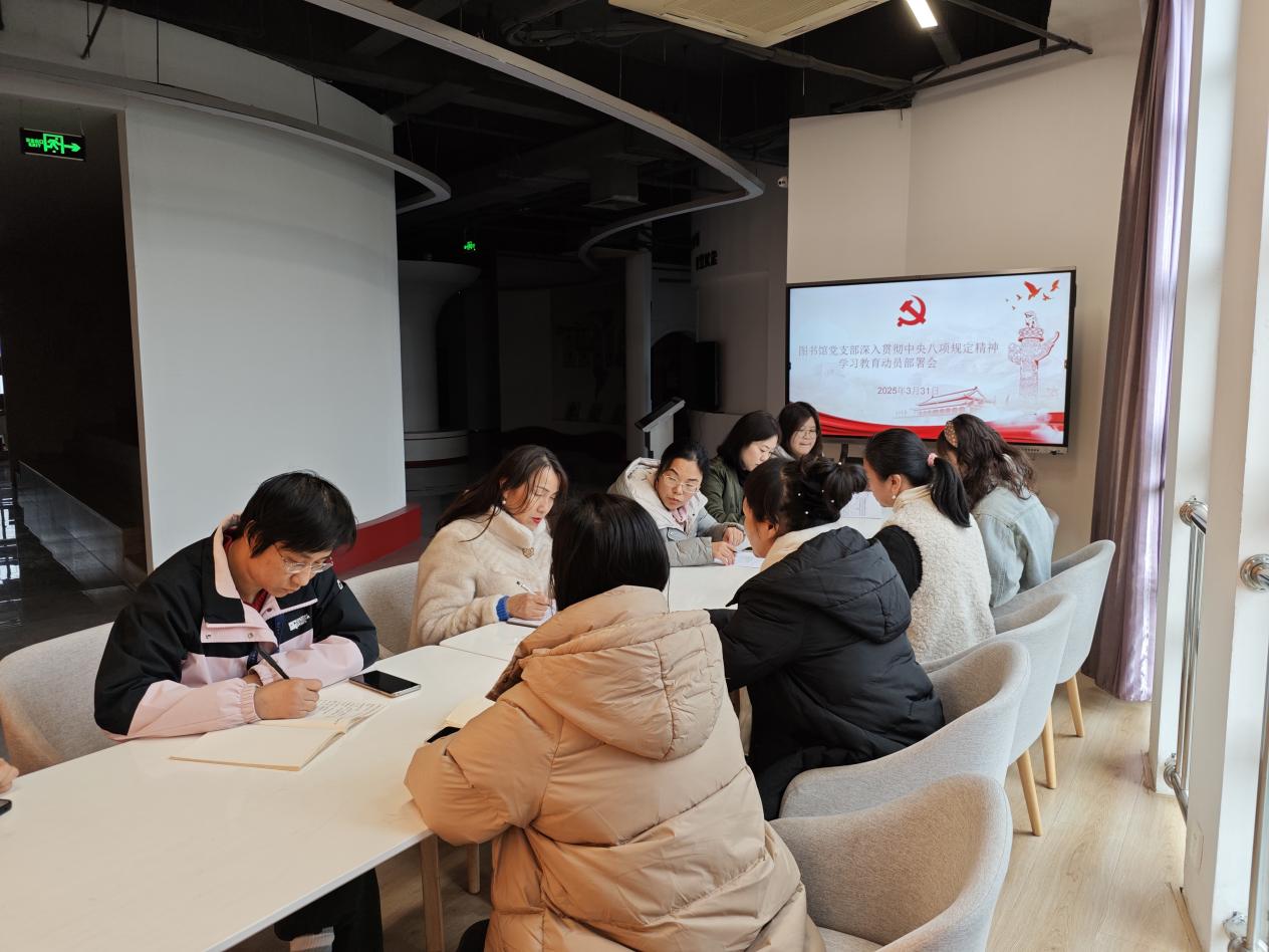 2025年3月31日,图书馆党支部召开专题会议,会议传达了学院关于深入贯彻中央八项规定精神学习教育动员会议的工作部署要求,全面动员和部署支部学习教育工作。会议由党支部陈林书记主持,全体党员参加。陈林书记指出,开展此次习教育是落实习近平总书记重要指示精神、巩固深化主题教育成果、推进全面从严治党向基层延伸的重要举措。支部全体党员干部要提高政治站位,深刻认识作风建设对学院高质量发展、师德师风建设及服务师生的重要意义,切实将思想和行动统一到党中央决策部署上来。会议强调,要结合图书馆工作实际,学深悟透,通过集中学习、个人自学等形式,深入领会中央八项规定精神的核心要义,将作风建设贯穿文献资源服务、读者服务、内部管理全过程;查改结合,对照党章党规和岗位职责,全面查摆服务意识、工作效能、纪律执行等方面存在的问题,建立整改台账并限期落实;长效常治,将学习教育与巡视整改相结合,完善制度规范,推动作风建设常态化、制度化。