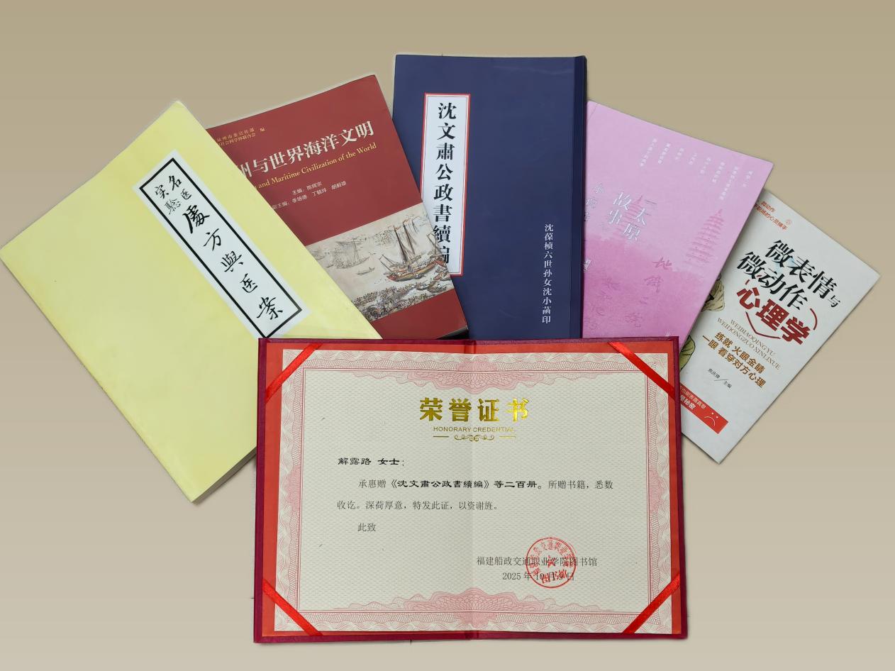 “图书馆是知识港湾,把书捐这儿能让更多人共享精神财富”,解老师的话简单却暖心。图书馆馆长陈林为解老师颁发捐赠证书,致敬这份教育者动人的坚守。
