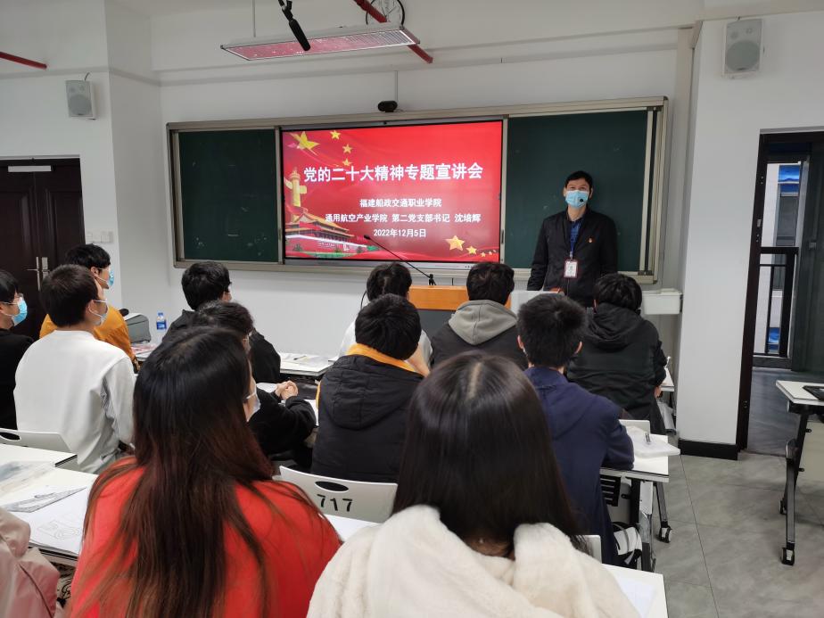 为深入贯彻党的二十大精神,引导学生深刻认识和准确把握党的二十大重大主题、重大理论观点、重大战略思想。12月5日,通用航空产业学院第二党支部书记沈培辉教授为2022级通用航空器维修专业1班学生讲授了题为《深入学习贯彻党的二十大精神,努力推动职业教育高质量发展》的专题党课。